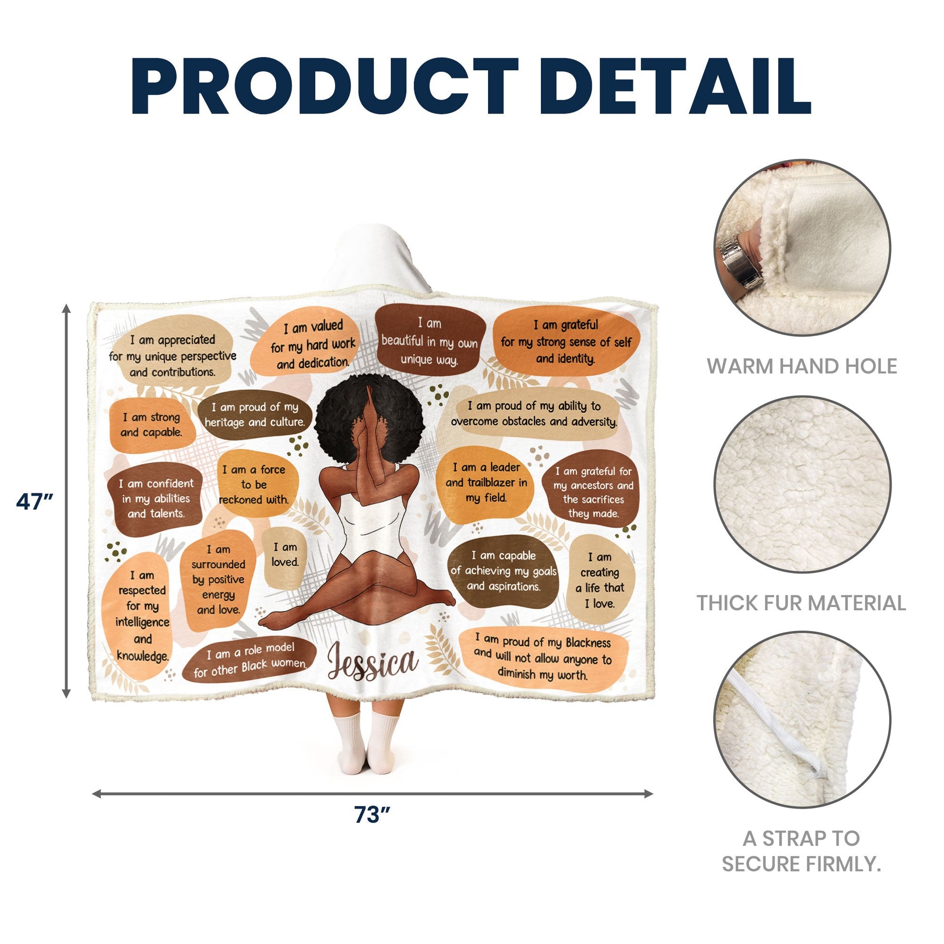 For the woman who carries her heritage, strength, and grace with unwavering pride—this blanket is her new armor of self-love. Picture your name (“Jessica”) elegantly displayed at the bottom, above an illustration of a woman in a meditative pose, surrounded by empowering affirmations that celebrate her uniqueness: “I am proud of my heritage and culture,” “I am a leader and trailblazer in my field,” “I am grateful for my strong sense of self and identity.” Set against a soft, earthy background with subtle floral accents, it’s a wearable manifesto of resilience and beauty.