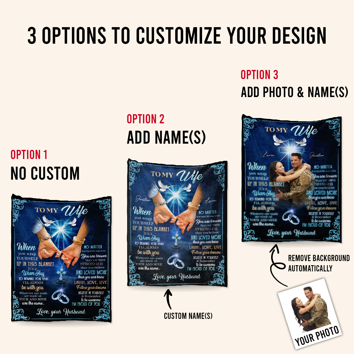 For the wife whose strength, bravery, and love light up your world—this blanket is more than just a cozy cover; it’s a tangible reminder of how proud you are of her, today and always. Imagine wrapping your wife in a blanket that celebrates her name and your bond—with a deep blue backdrop, a glowing cross, two white doves, and heartfelt text: “When you wrap yourself up in this blanket, it’s a warm hug to remind you that I’ll always be with you—no matter how hard life gets.” The names “Lauren” and “Jonathan” are prominently displayed, making it a custom tribute to your unbreakable marriage.
