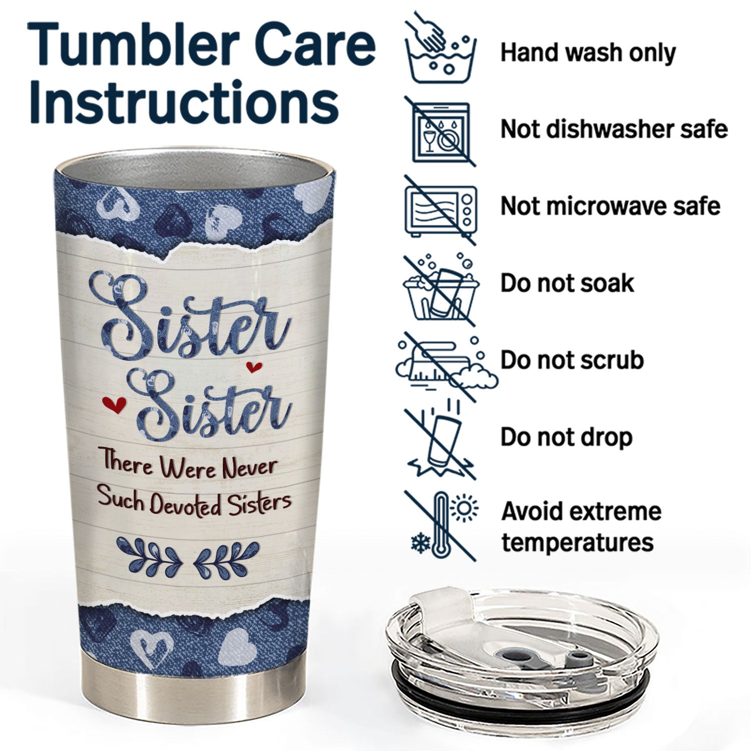 For the sisters whose bond is as unbreakable as your love for denim and shared laughter—for whom every fight feels like a team effort, every hug feels like home, and every moment together is pure magic—this tumbler isn’t just a drink holder; it’s a wearable testament to your sisterhood, a daily reminder of your loyalty, and a custom keepsake to carry your love (and your jeans) wherever you go.