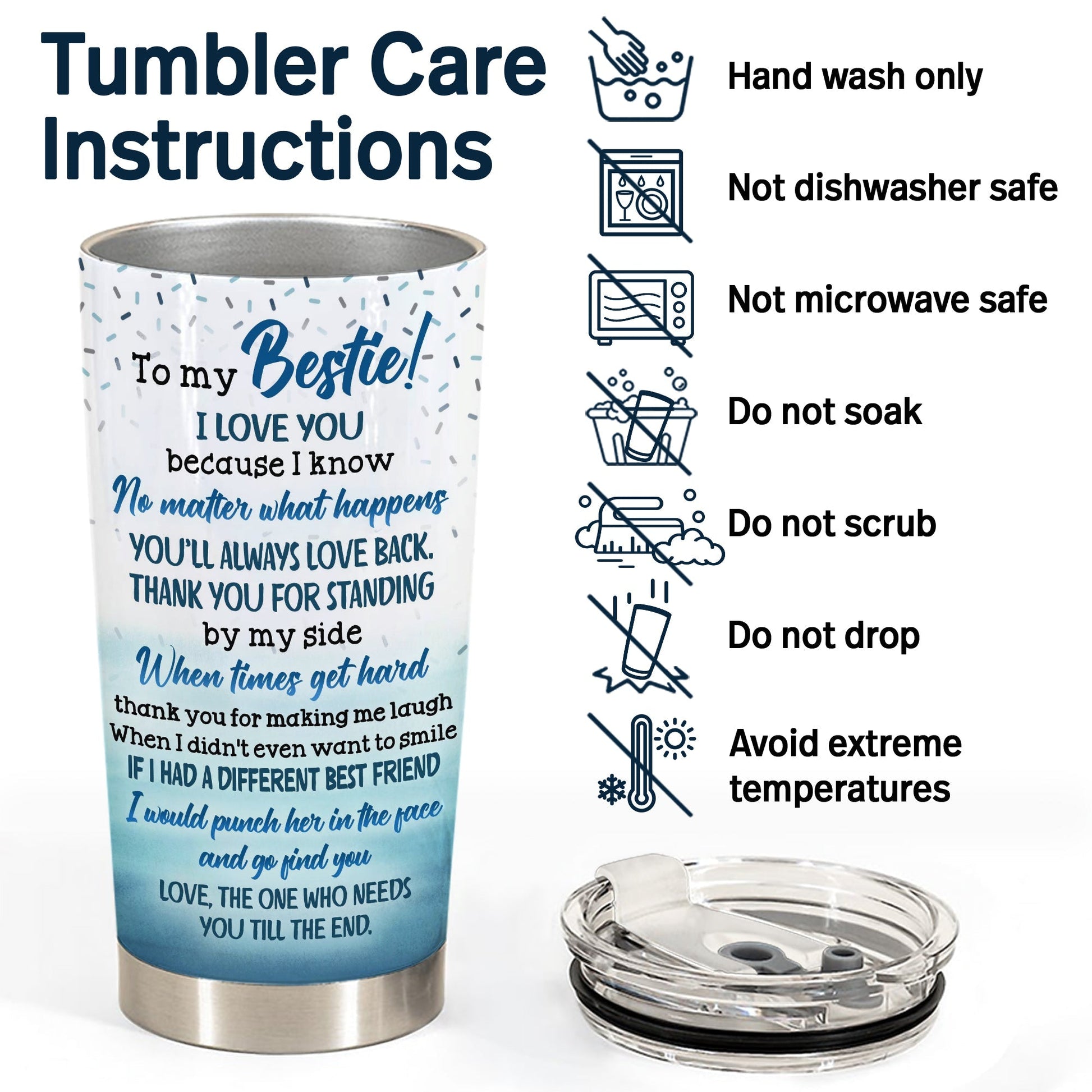 Imagine sipping from this stainless steel tumbler—adorned with a cheerful blue gradient background dotted with confetti-like sprinkles, two illustrated besties (Sophia & Jessica) posing with peace signs, and heartfelt text on the back: “To my Bestie! I love you because I know no matter what happens, you’ll always love back. Thank you for standing by my side when times get hard.” The names are front and center, making it a custom tribute to your unbreakable friendship.