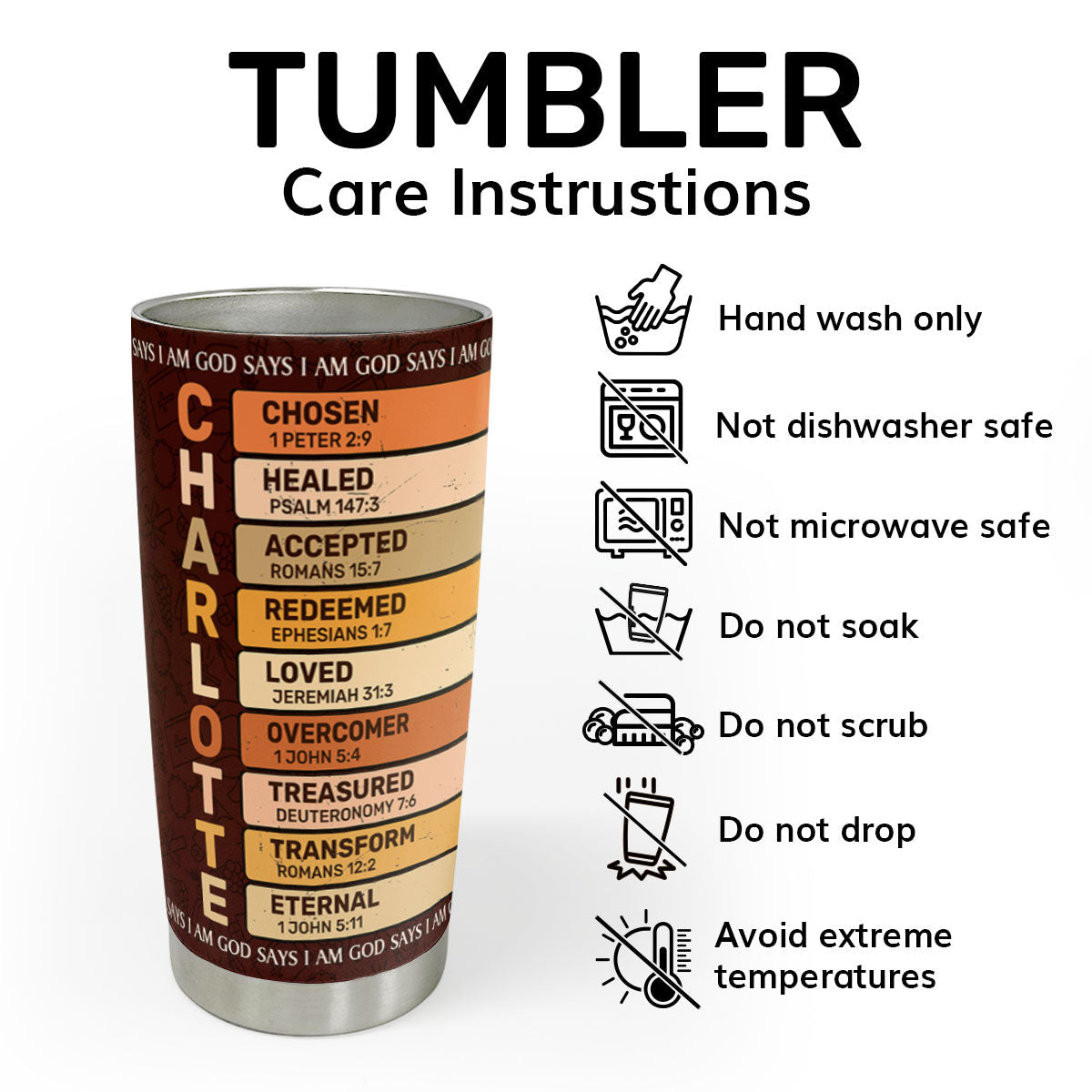 Imagine sipping from this stainless steel tumbler—adorned with a warm, earthy design, rows of powerful biblical affirmations like “Chosen (1 Peter 2:9)”, “Healed (Psalm 147:3)”, and “Loved (Jeremiah 31:3)” on both sides, and the name “Charlotte” prominently displayed. This tumbler turns a simple drink into a sacred ritual of grounding yourself in God’s love.