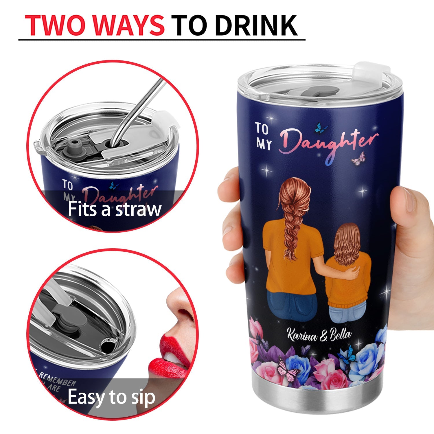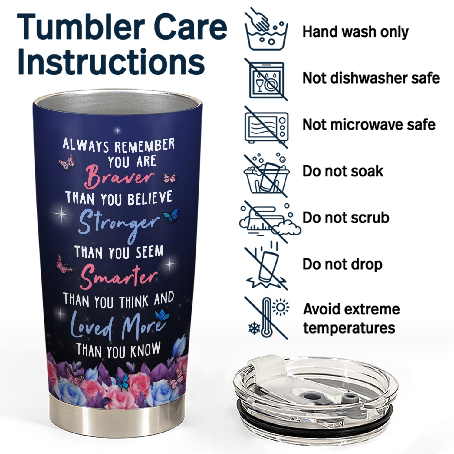 Imagine gifting this stainless steel tumbler—adorned with a deep blue design, an illustration of a mother and daughter (Scarlett & Jasmine) sitting closely together with their arms around each other, surrounded by pink/blue roses and butterflies on the front, and the heartfelt affirmations “Always remember you are braver than you believe, stronger than you seem, smarter than you think, and loved more than you know” on the back. This tumbler turns a simple drink into a sacred ritual of celebrating your unbreakable bond.