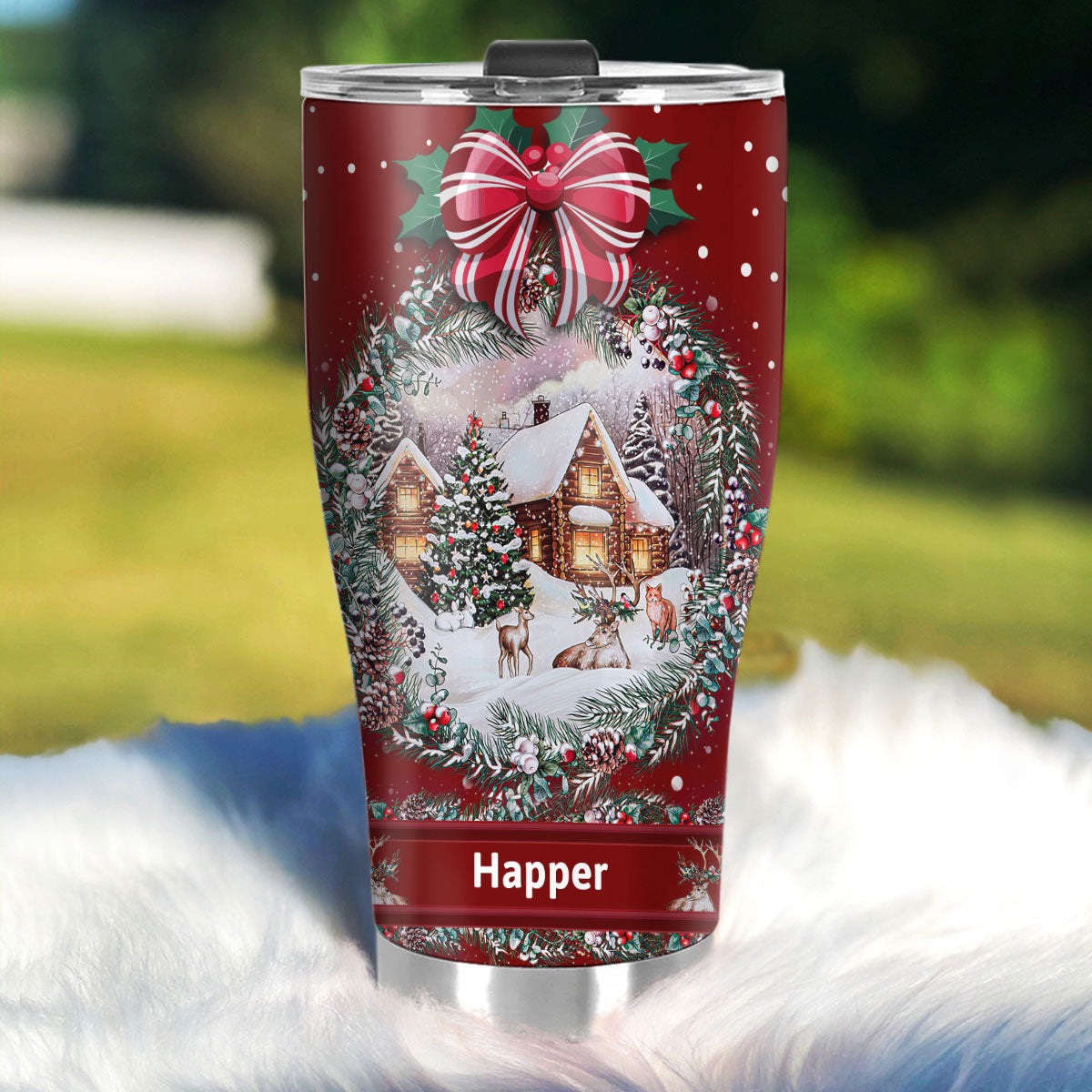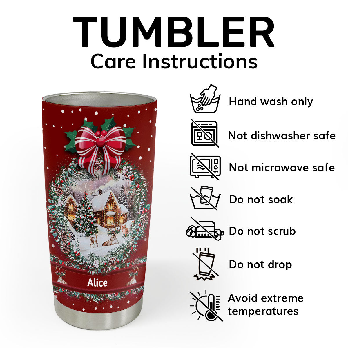 Imagine gifting this stainless steel tumbler—adorned with a cozy winter scene: a snow-covered cabin with twinkling lights, a decorated tree, reindeer grazing nearby, and a large red bow with holly leaves. On the back, the tender scripture “Be Still And Know That I’m God (Psalm 46:10)” and the name “Alice” add a personal touch. This tumbler turns a simple drink into a sacred ritual of celebrating Christmas with faith.