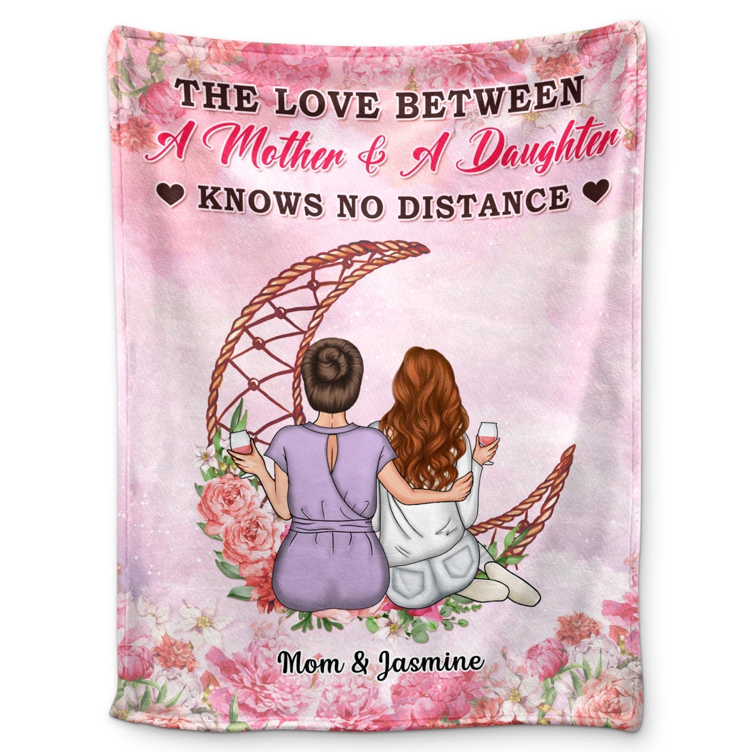 Imagine wrapping yourself in this soft, plush pink blanket—adorned with a floral design, an illustration of a mother (Mom) and daughter (Jasmine) sitting closely on a crescent moon swing, and the heartfelt text “The Love Between A Mother & A Daughter Knows No Distance” at the top. This blanket turns a simple snuggle into a sacred ritual of celebrating your unbreakable bond.