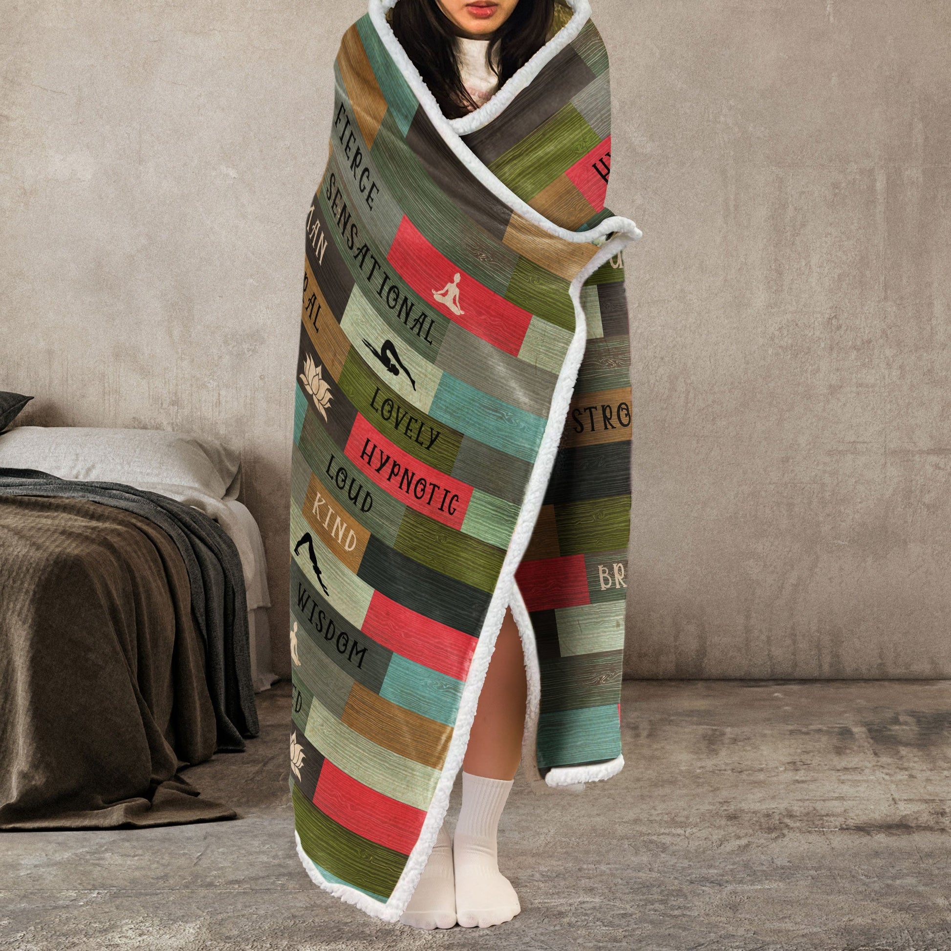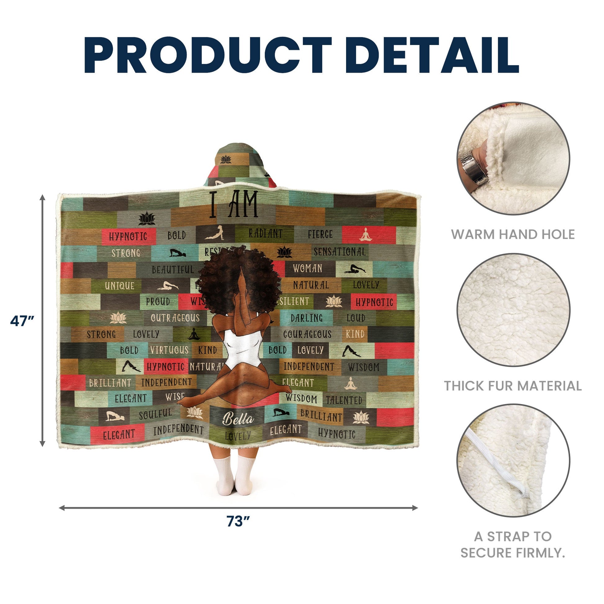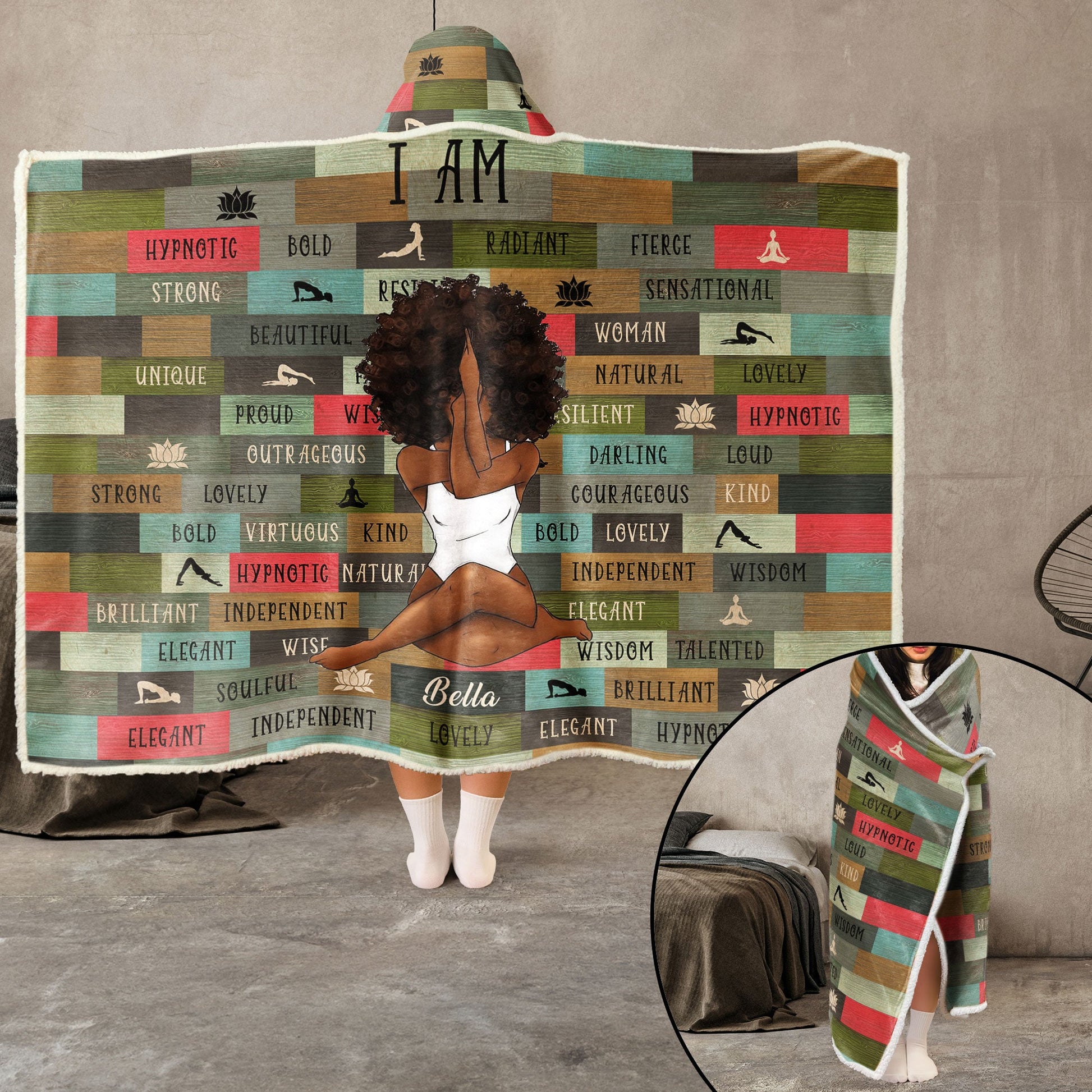 Imagine draping yourself in this soft, plush hooded blanket—adorned with a colorful patchwork of empowering words (“I AM”, “BOLD”, “RADIANT”, “STRONG”), an illustration of a woman (Bella) meditating, and room for personalization. This blanket turns a simple snuggle into a sacred ritual of celebrating your unapologetic self-love.