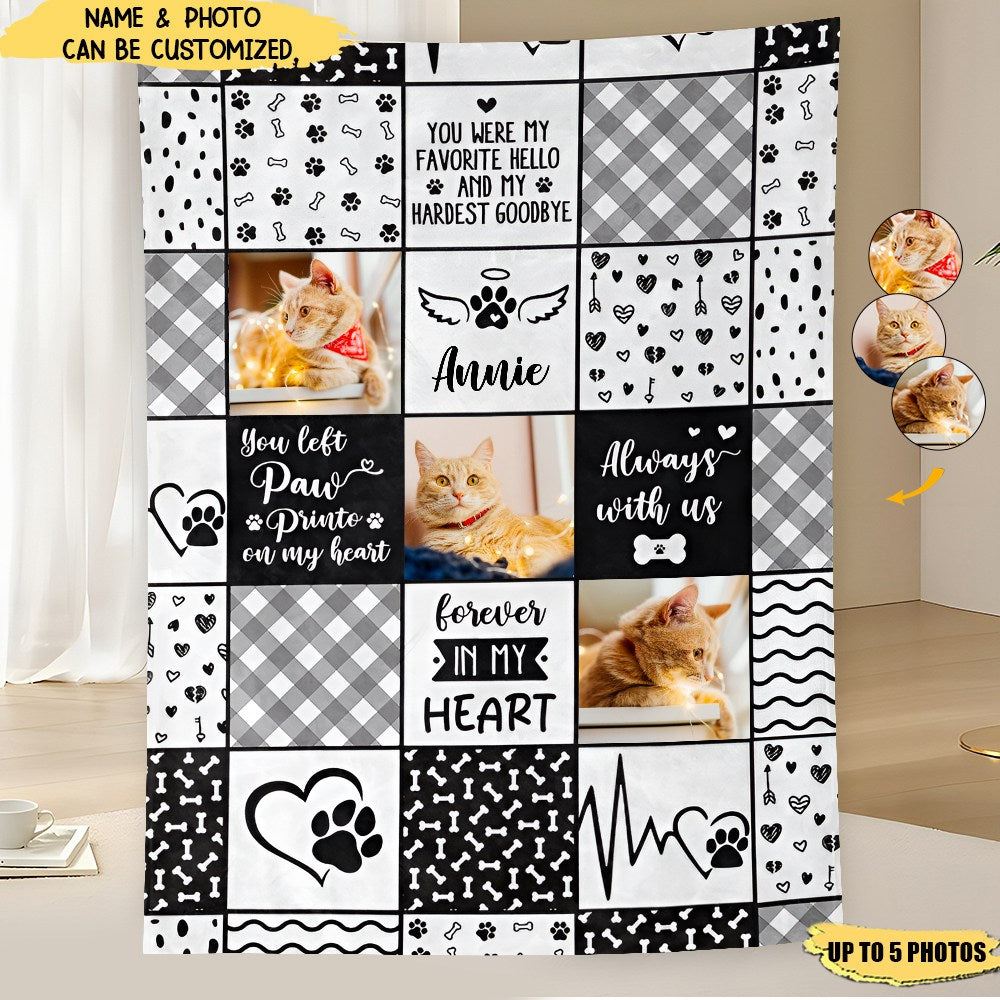 Featuring up to 5 customizable photo panels where you can display your favorite memories together, this blanket becomes a living collage of your shared journey. The thoughtful design includes symbolic elements like paw prints, bones, hearts, and EKG lines that represent the life and connection you shared, while the reassuring message “Always with us” and “forever IN MY HEART” remind you that their love never truly leaves.