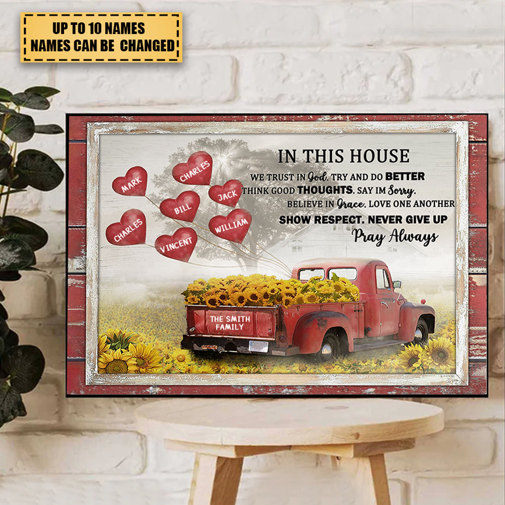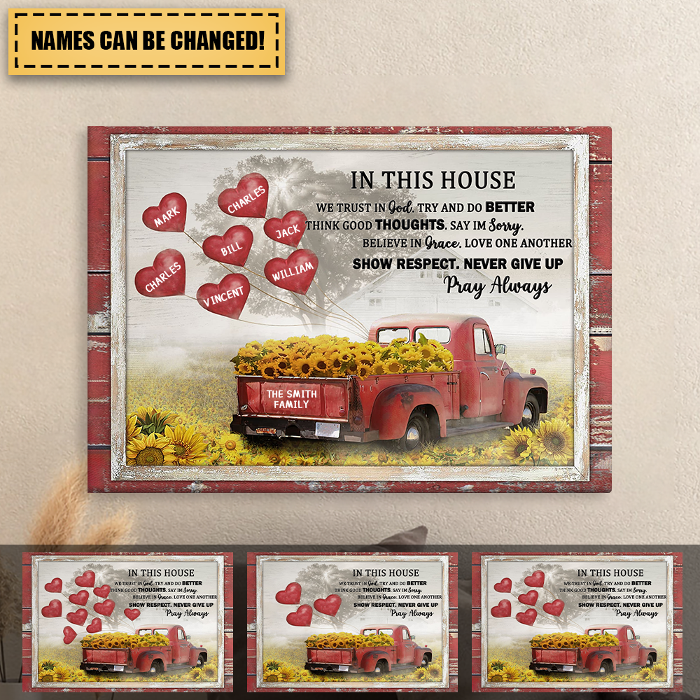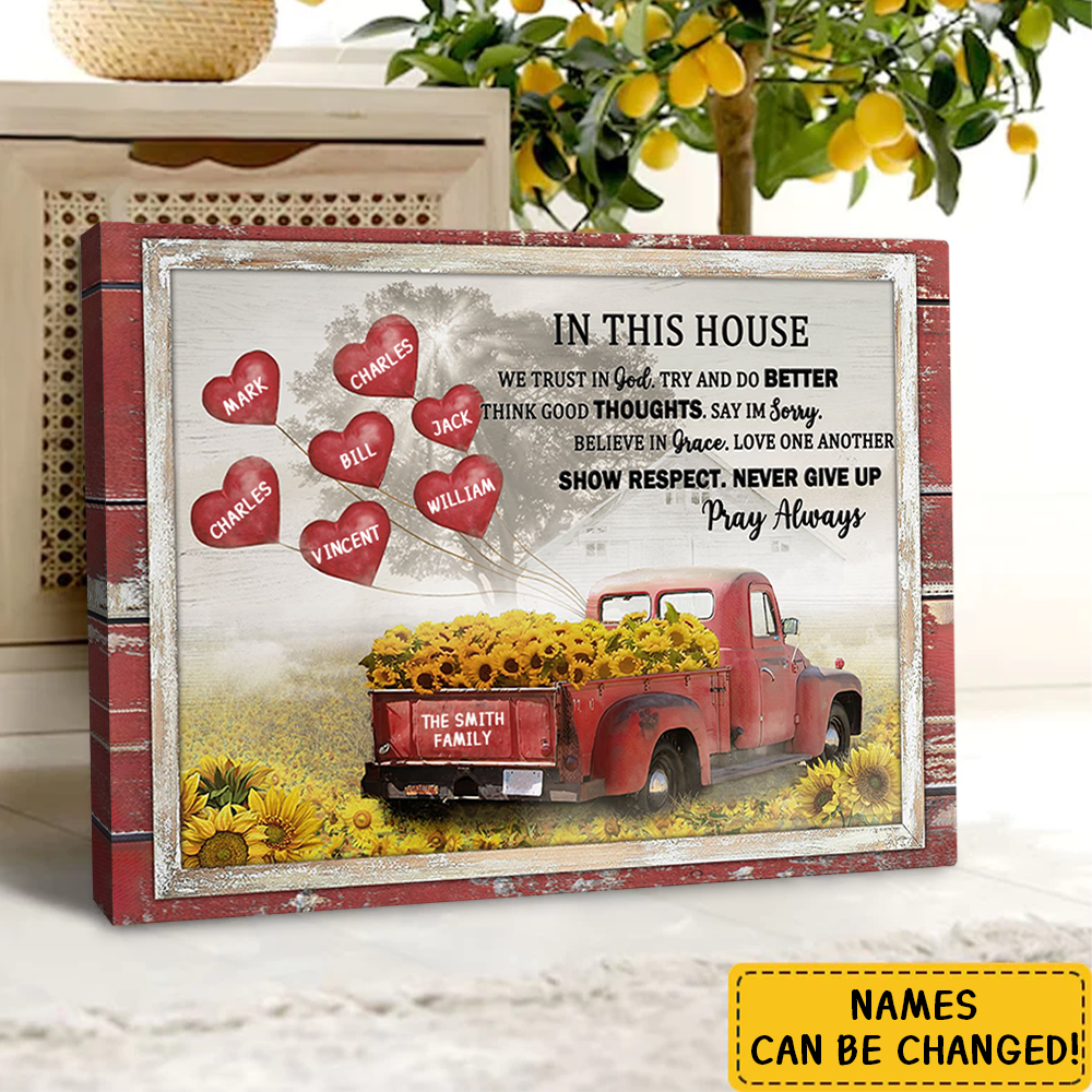 Imagine this rustic canvas gracing your wall—featuring your family name alongside the heartfelt message“IN THIS HOUSE WE TRUST IN GOD, LOVE ONE ANOTHER, NEVER GIVE UP”that captures the essence of your family values. The beautiful red truck creates a nostalgic atmosphere, while the sunflowers add warmth to this meaningful keepsake. The personalized names create a loving atmosphere that makes every moment feel like your personal celebration.