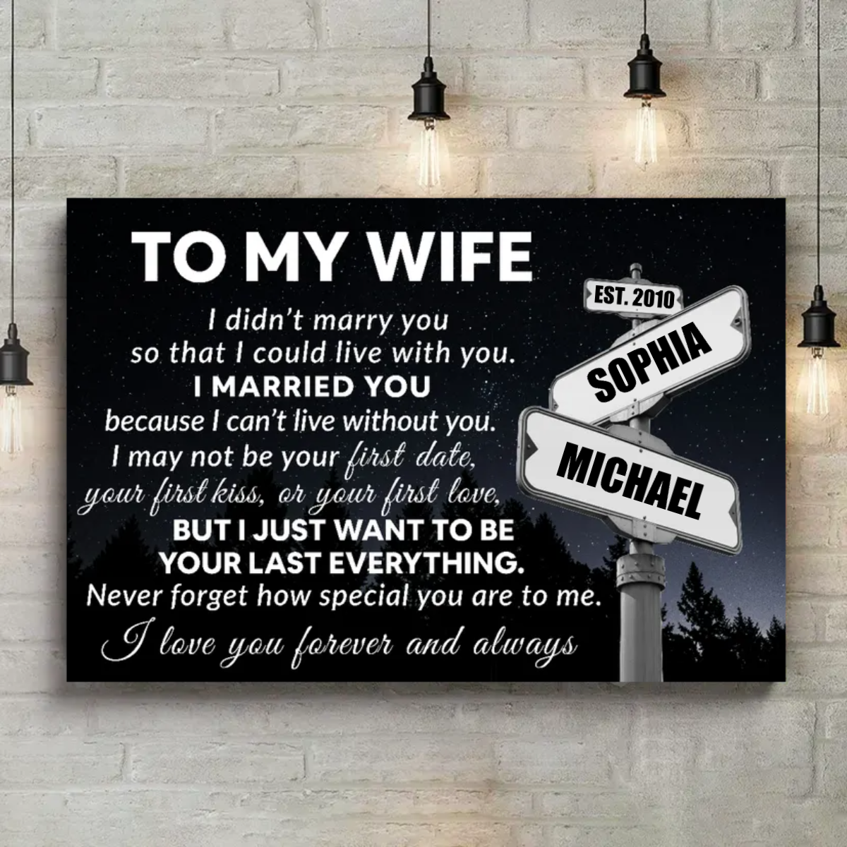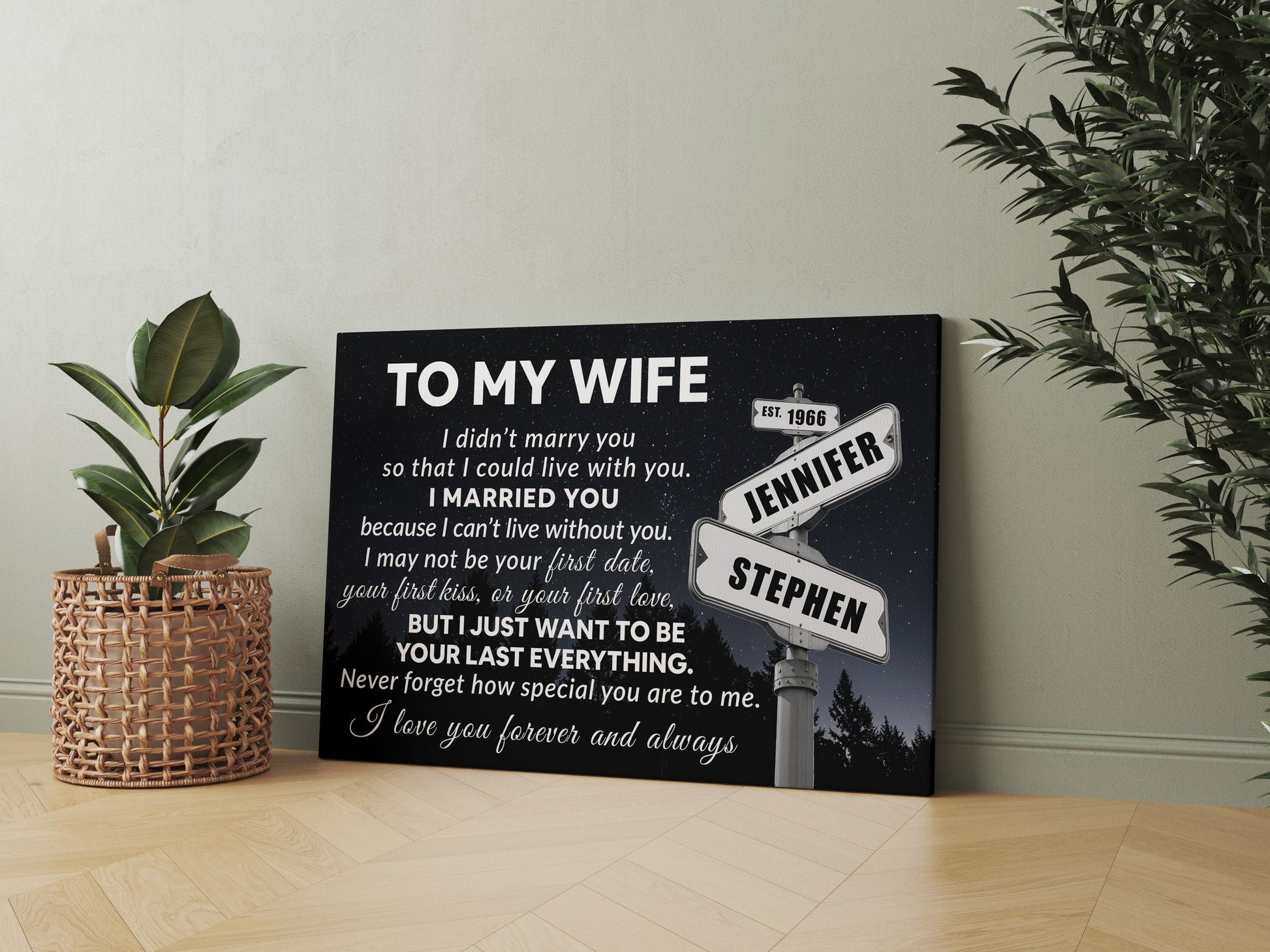 Imagine this romantic canvas gracing your wall—featuring Sophia & Michael’s names alongside the heartfelt message“I MARRIED YOU BECAUSE I CAN’T LIVE WITHOUT YOU”that captures the essence of your perfect love. The beautiful starry night creates a magical atmosphere, while the street signs add personal charm to this meaningful keepsake. The personalized names create a loving atmosphere that makes every moment feel like your personal celebration.