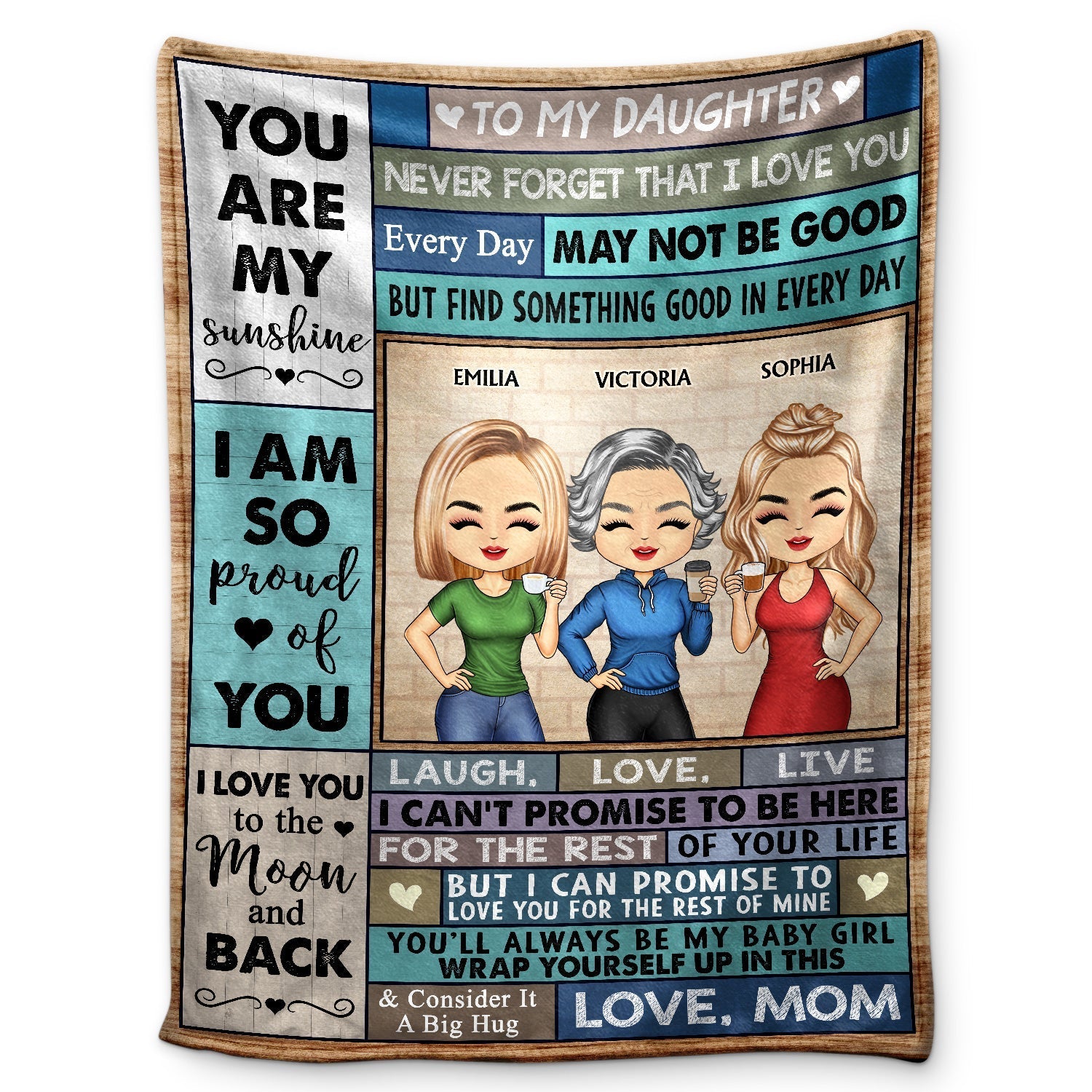 Imagine this stunning blanket wrapping your daughter in warmth—featuring Emilia, Victoria & Sophia alongside the heartfelt message“YOU ARE MY sunshine”that captures the essence of your perfect mother-daughter celebration. The beautiful warm design creates a loving atmosphere, while the personalized names add family charm to this meaningful keepsake. The personalized names create a caring atmosphere that makes every moment feel like your personal celebration.