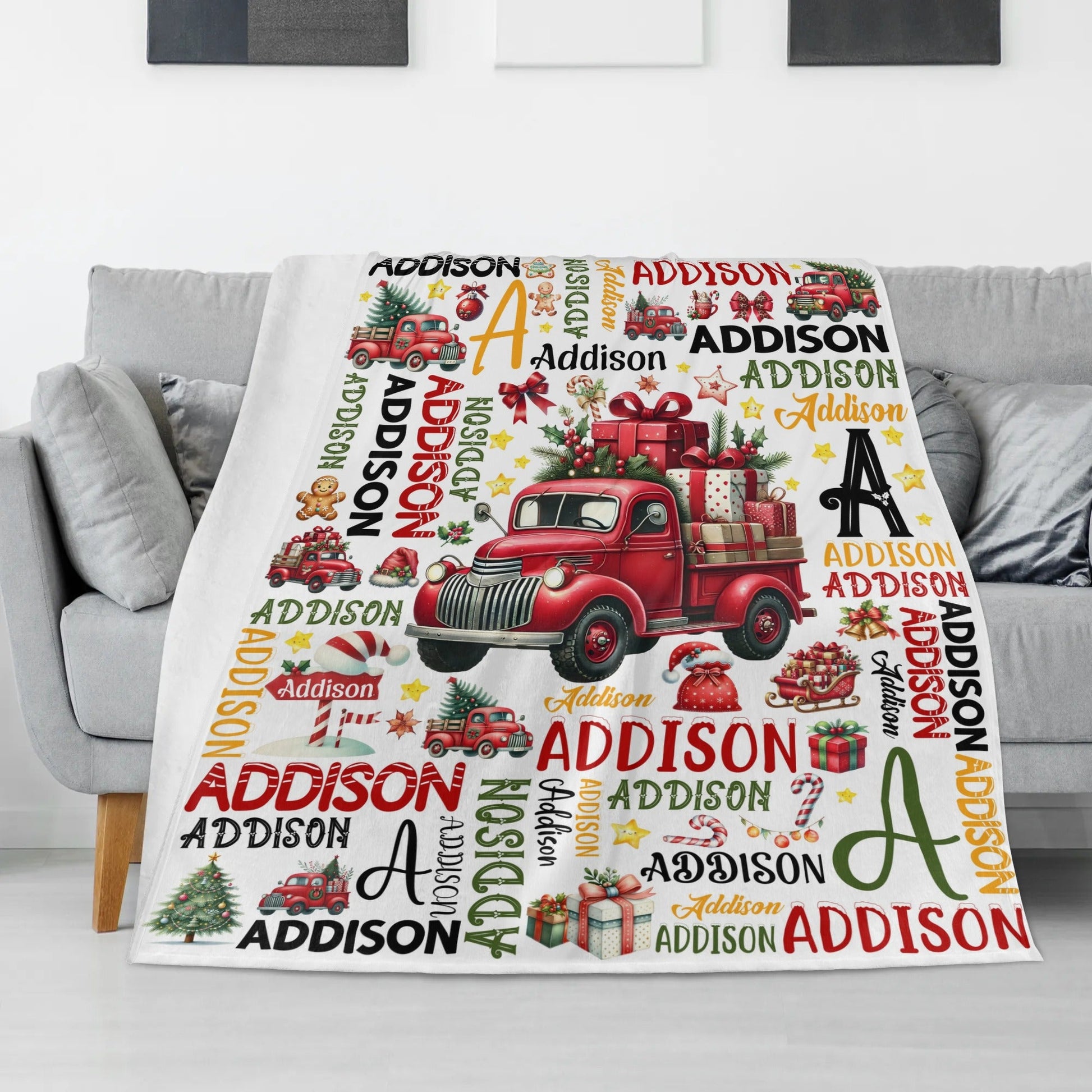 Imagine this stunning personalized blanket wrapping you in Christmas comfort—featuring your name displayed throughout a delightful winter wonderland, centered around a vintage red truck loaded with gifts and surrounded by festive elements like candy canes, Christmas trees, gingerbread men, and sparkling stars. The vibrant red and green color scheme creates an atmosphere of holiday cheer and nostalgia, while the playful mix of fonts and personalized touches transforms this blanket from simple bedding into a beautiful heirloom that honors the beautiful way your Christmas traditions bring joy and magic to your life.