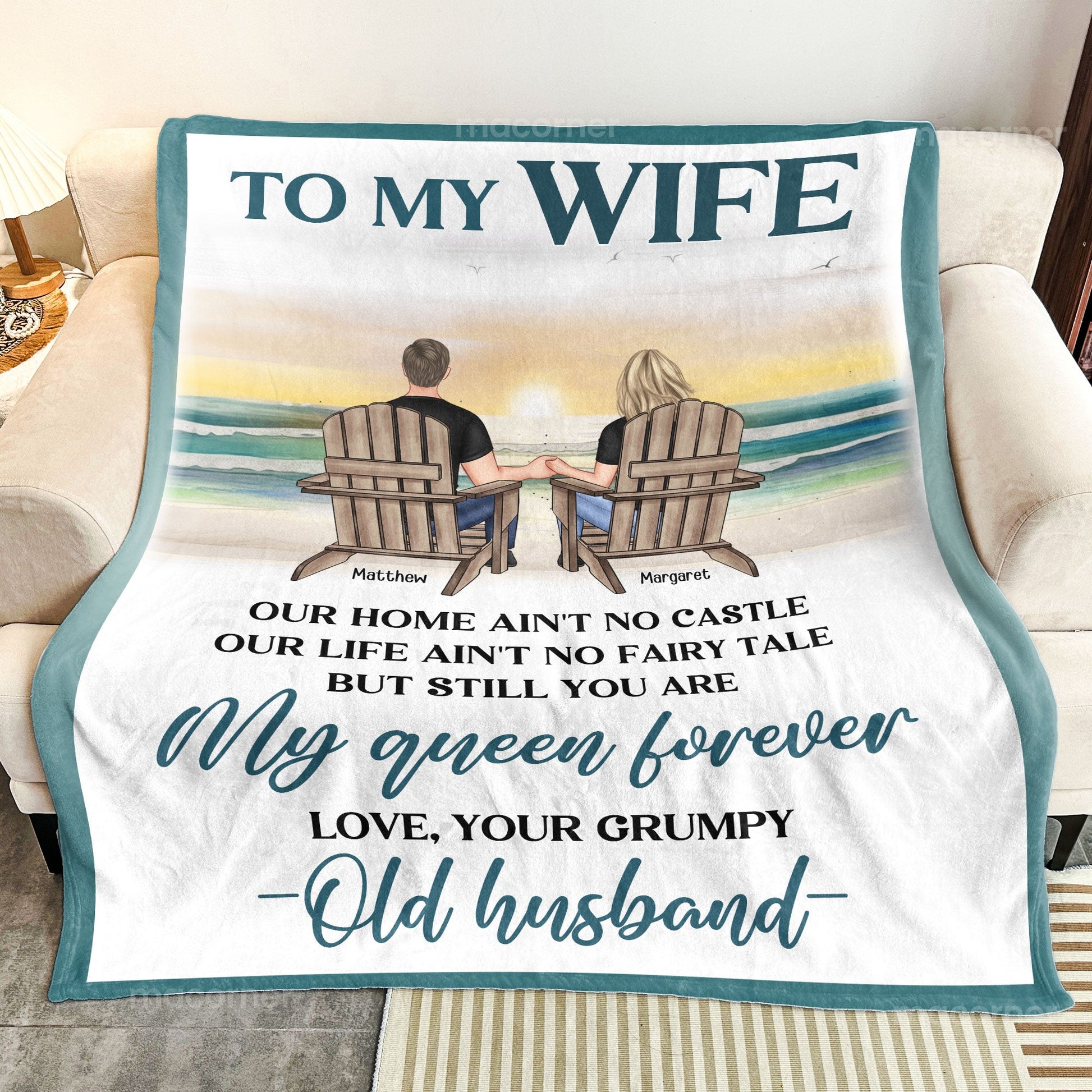 From the bold teal typography that displays “TO MY WIFE” with loving emphasis to the flowing cursive script that whispers “My queen forever” with romantic elegance, every detail of this blanket whispers “eternal devotion” in its own special way. The warm sunset colors and coastal aesthetic create a cozy, inviting atmosphere that speaks of shared dreams and quiet moments, while the playful closing “LOVE, YOUR GRUMPY Old husband” adds that perfect touch of authentic humor that makes your love story uniquely yours. It’s more than just a blanket; it’s a celebration of your beautiful marriage, a daily reminder of the queen who captured your heart, and a beautiful tribute that holds your precious moments close—because when it comes to love, there’s nothing more precious than honoring the journey that makes your love story uniquely yours, captured in the timeless beauty of beach sunsets and unwavering devotion.