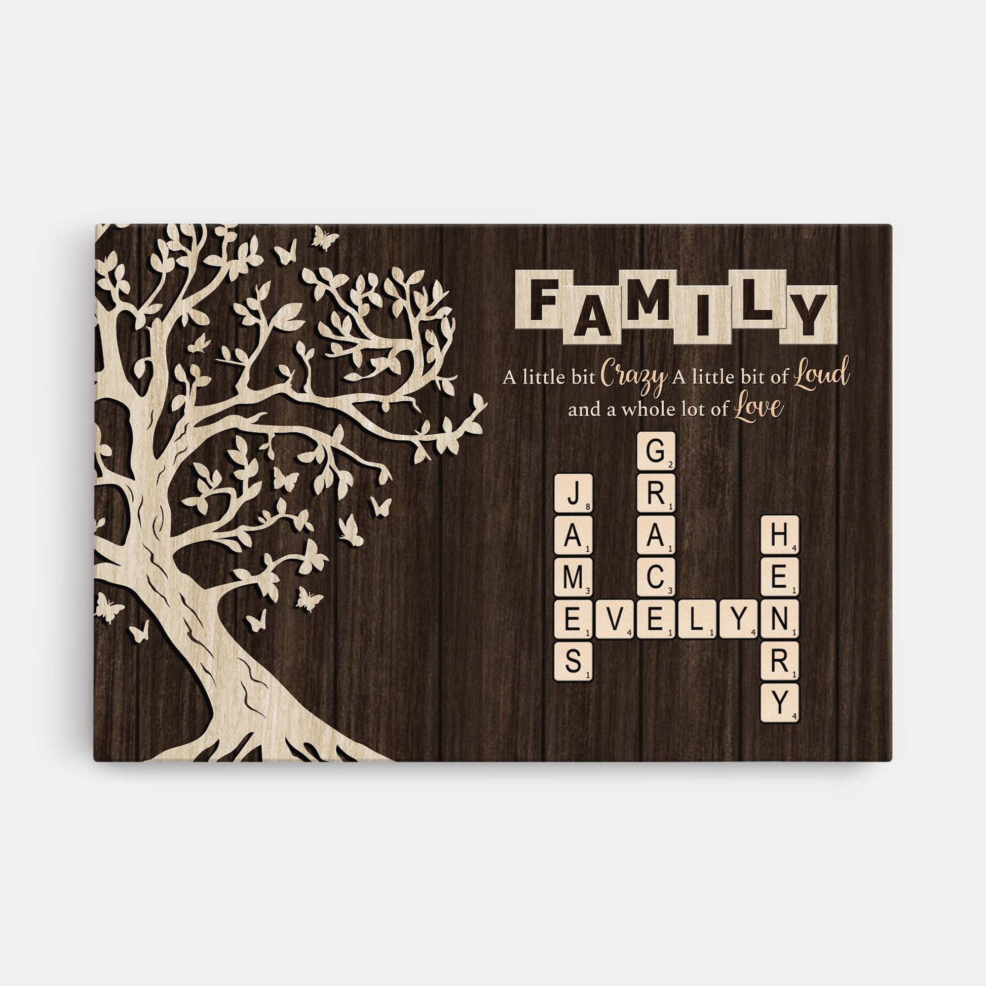 From the large, Scrabble-style “FAMILY” title that stands proud against the rustic wood to the elegant cursive script that flows with heartfelt emotion, every detail of this canvas whispers “family love” in its own special way. The warm brown wood grain creates a perfect backdrop that makes the beige tree and letter tiles pop, while the interconnected name puzzle adds that authentic, game-night charm that speaks of tradition and togetherness. It’s more than just decor; it’s a celebration of your beautiful family journey, a daily reminder of the crazy, loud, and wonderful moments that make your family extraordinary, and a beautiful tribute that holds your precious memories close—because when it comes to family, there’s nothing more precious than honoring the journey that makes your story uniquely yours, captured in the timeless beauty of family trees and unconditional love.