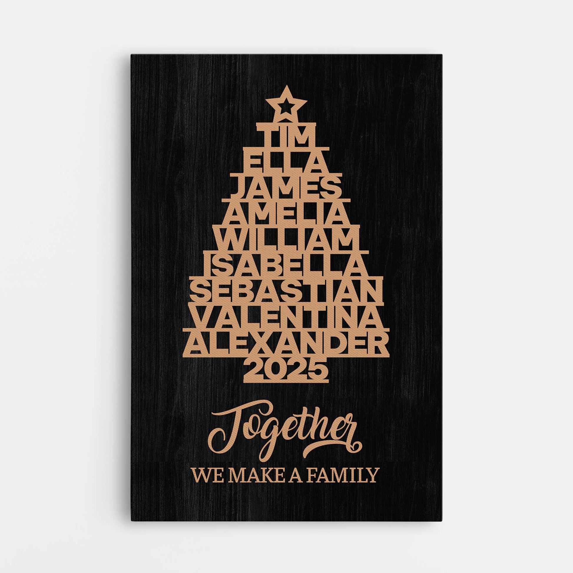 Imagine this stunning personalized canvas gracing your home—featuring your family’s names beautifully arranged in the shape of a Christmas tree, with longer names forming the sturdy base and shorter names reaching toward the shining star at the top, symbolizing how each family member contributes to your beautiful unity. The deep black background with subtle wood grain creates an atmosphere of elegant warmth, while the warm copper/rose gold tones add that perfect touch of modern sophistication that makes your family uniquely yours.