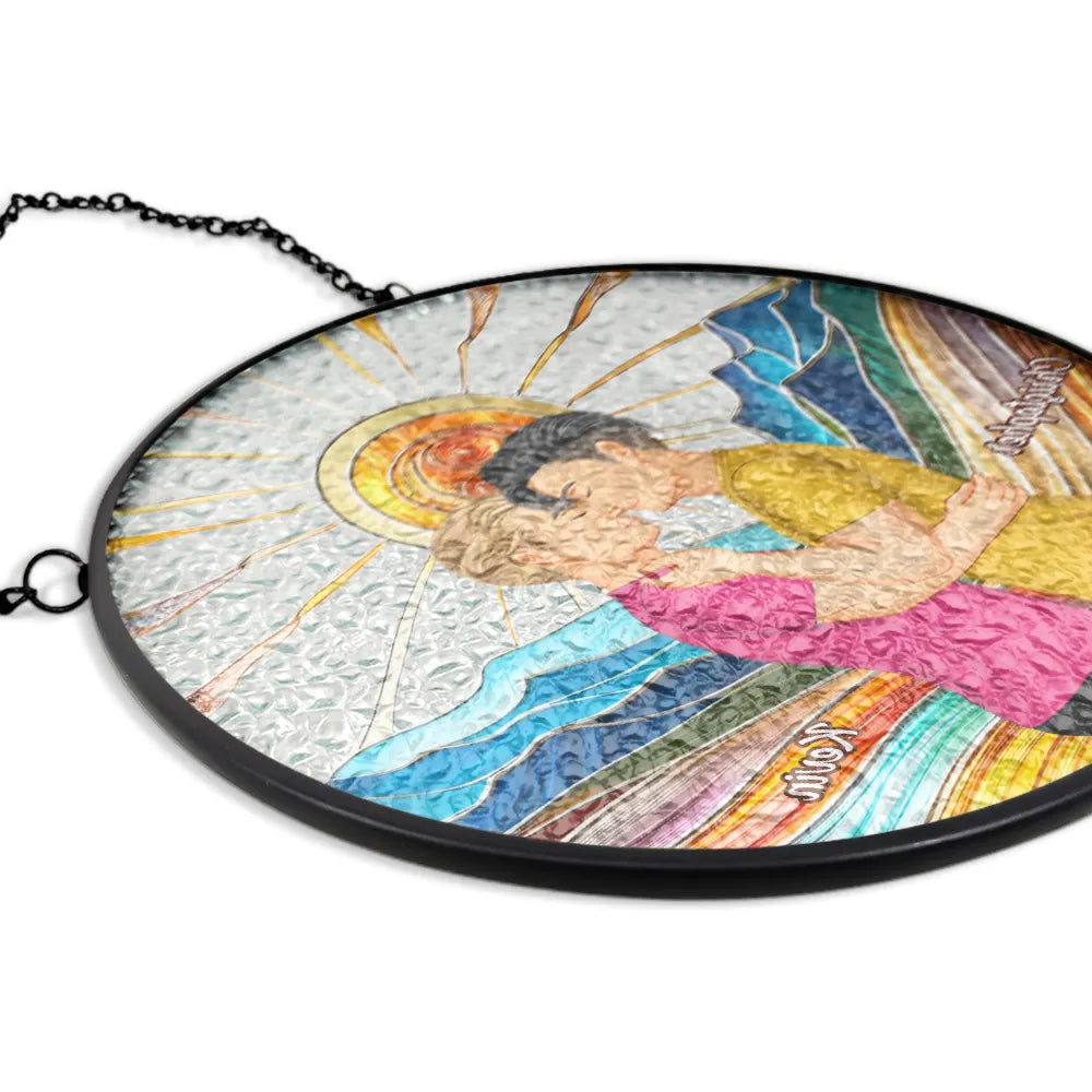 Imagine this stunning personalized stained glass suncatcher gracing your home—featuring a soft, colorful background that adds a cozy, heartfelt feel, with the couple embracing, setting the tone for a celebration of family and togetherness. The names “William” and “Jennifer” in a mix of elegant and heartfelt fonts add a powerful touch, emphasizing the strength of your family bond. The ability to customize the couple’s names allows for deep personalization, reflecting your unique story.
